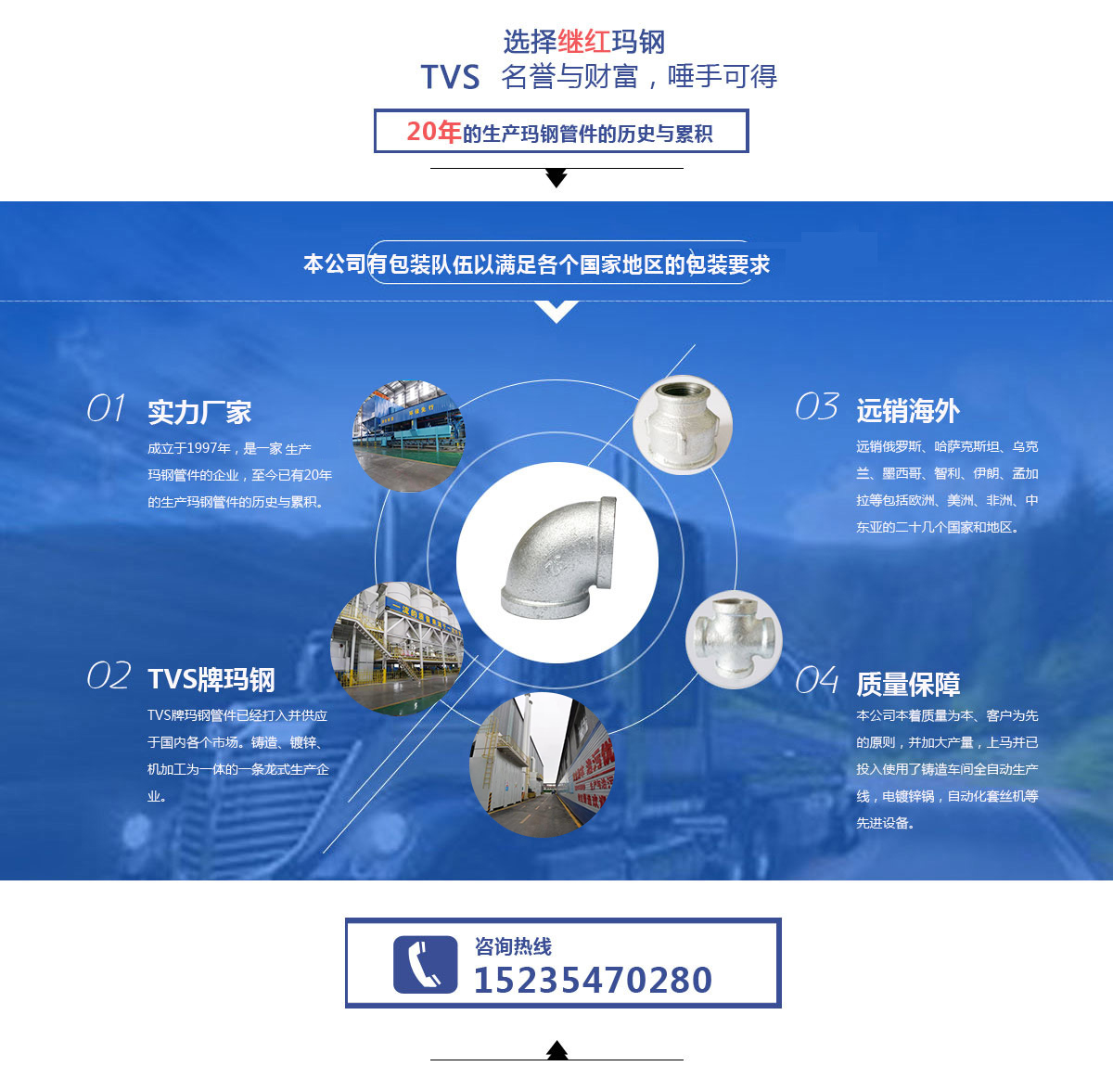 近幾年來(lái),本公司亦開始涉足國(guó)內(nèi)瑪鋼管件的生產(chǎn)和銷售。TVS牌瑪鋼管件已經(jīng)打入并供應(yīng)于國(guó)內(nèi)各個(gè)市場(chǎng)。